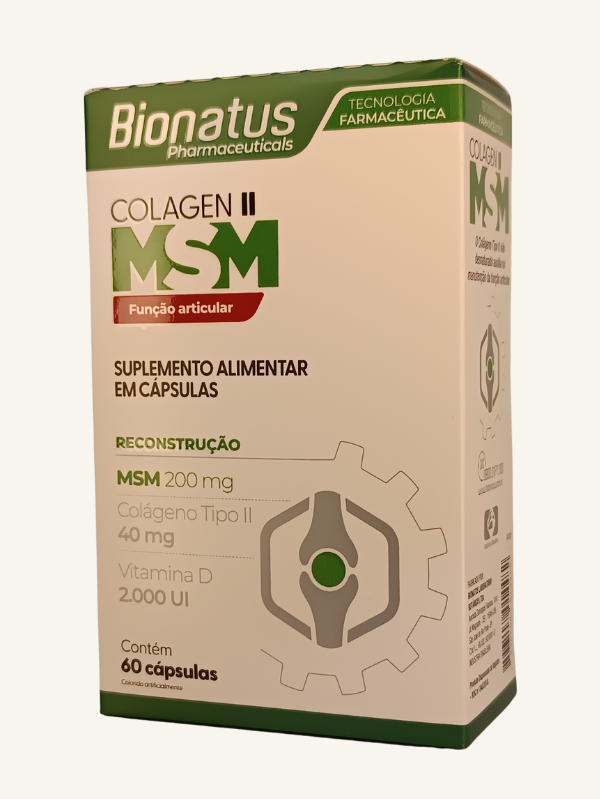 O Colagen II MSM é um suplemento alimentar com colágeno tipo II, MSM e vitamina D. Produto natural, sem glúten e sem lactose, ideal para complementar uma rotina saudável.