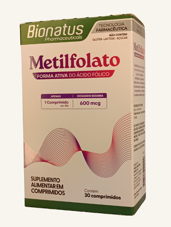 O Metilfolato é um suplemento alimentar em comprimidos que contém a forma ativa do ácido fólico (L-Metilfolato), oferecendo absorção eficiente e prática para o uso diário.